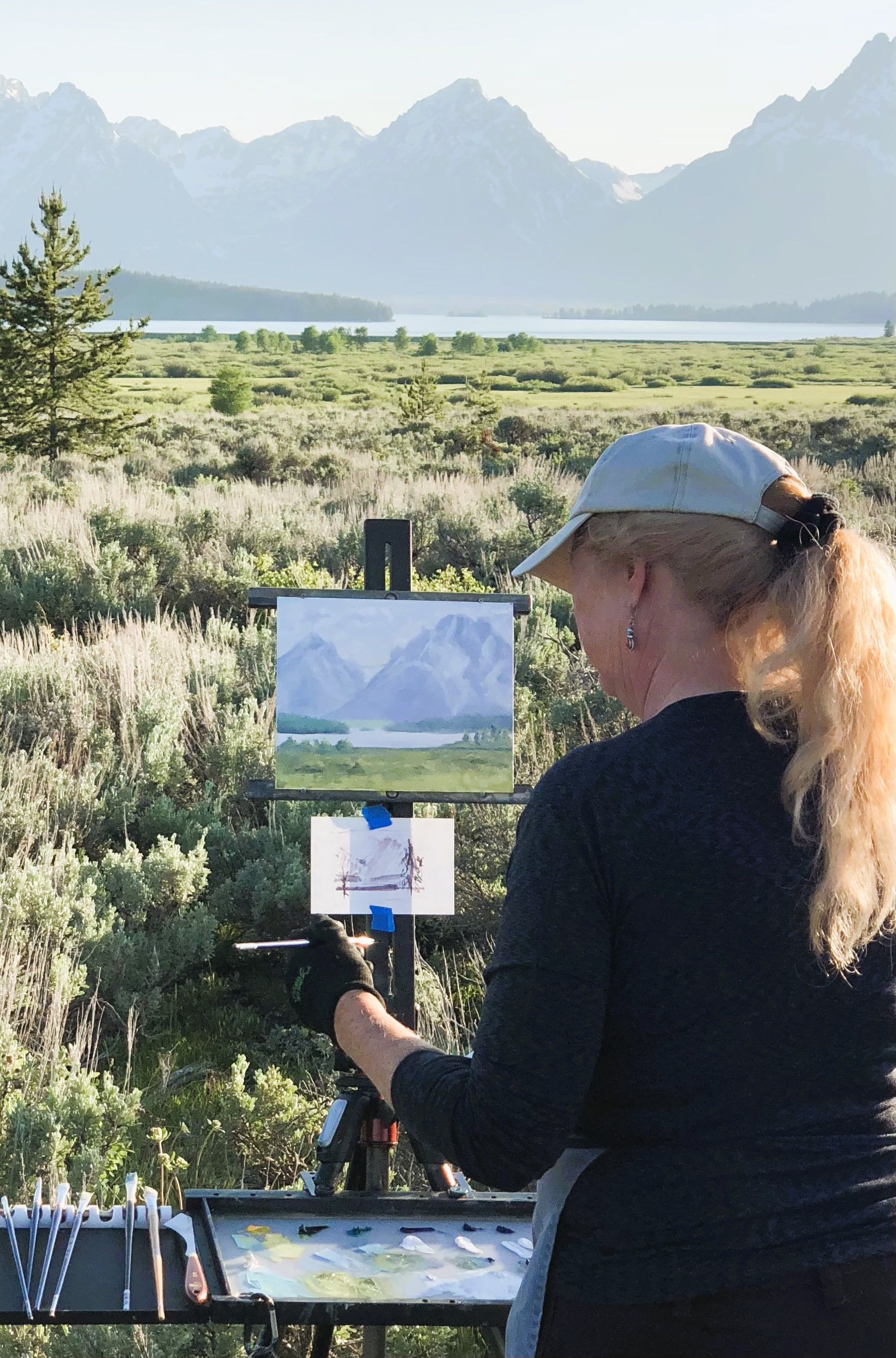 Terry Irwin sketching a mountain scene, photographed by her husband, John.
